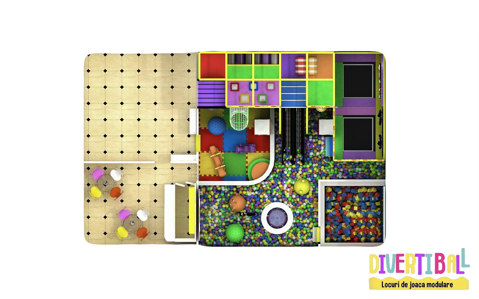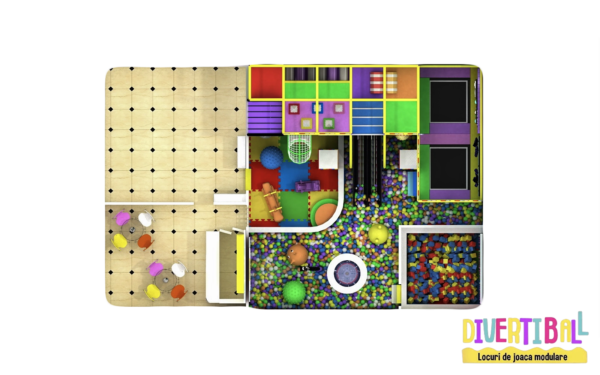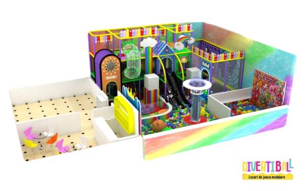 Acest loc de joacă modular cu temă Rainbow – DBC10 este o alegere spectaculoasă pentru spațiile interioare destinate copiilor. Structura este protejată complet cu bureți de siguranță și montată pe un paviment puzzle ce acoperă întreaga suprafață. Accesul se realizează prin platforme intermediare, un tunel de plasă curbat și zone de design tip căsuțe, unele elemente fiind decorate cu LED-uri luminoase. Atracțiile principale includ un tobogan dublu cu LED-uri, două trambuline cu afișaj electronic, un videoproiector interactiv și o fântână de bile. Copiii mai mari se pot antrena în zona de mișcare intensă, unde se găsesc panouri de cățărare și cuburi de burete, alături de obstacole dinamice: piramide mici și mari și saci de box. Distracția este completată de două leagăne și două pantofare, toate integrate într-o temă veselă, plină de culoare, perfectă pentru proiecte de amenajări locuri de joacă moderne, destinate spațiilor de joacă de interior pentru copii.