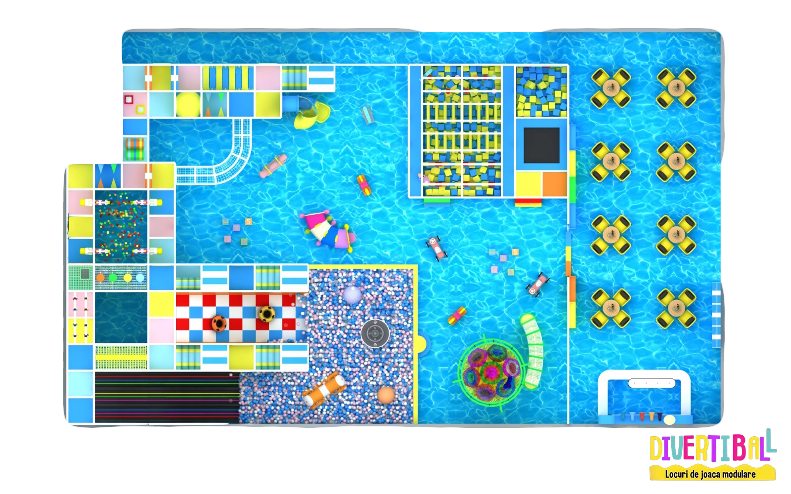 Zona este completată de animăluțe marine din plastic, un gonflabil tematic, balansoare, mașinuțe și obiecte de design marin, oferind un decor unic și atractiv. Acest loc de joacă modular este o soluție completă pentru spații de joacă pentru copii interior, complet personalizabilă și livrată cu montaj profesionist.