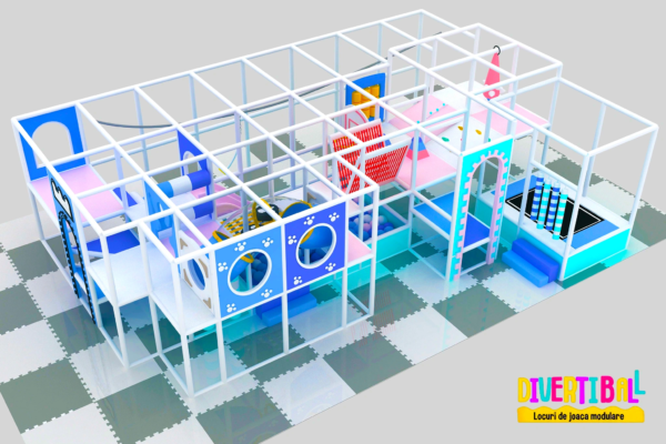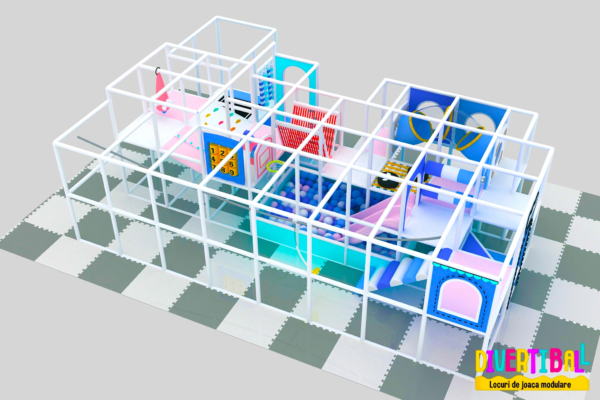 Loc de joacă modular de 11,00m x 6,00m x 2,80m, ideal pentru amenajări locuri de joacă interioare, oferind o gamă largă de activități pentru dezvoltarea abilităților motorii ale copiilor. Acesta include un panou tip „SPIDER”, cilindri verticali, tobogan liniar, și o tiroliană. De asemenea, oferă un tunel colorat și un pod tibetan, stimulând distracția și exercițiile fizice.
