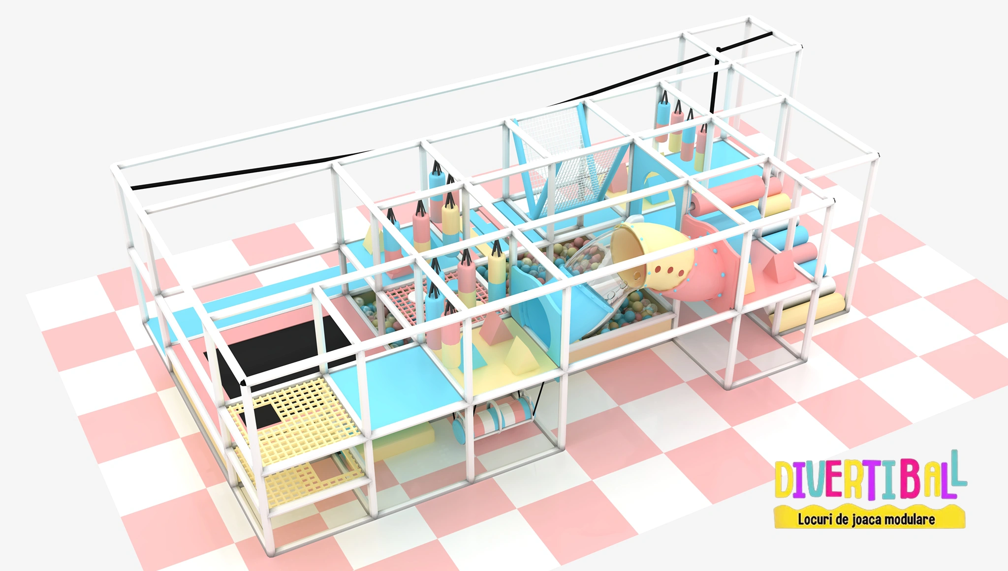 Obstacolele tip piramidă și sacii de box sunt perfecte pentru exerciții fizice, iar toboganul dublu permite jocul în tandem. Alte elemente interactive includ leagănul, tiroliana, și scara semirotundă pentru dezvoltarea echilibrului și coordonării. În plus, tunelul colorat și podurile tip V completează experiența de aventură. Acest loc de joacă modular poate fi personalizat pentru a se potrivi nevoilor oricărui spațiu interior de joacă.