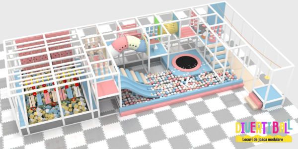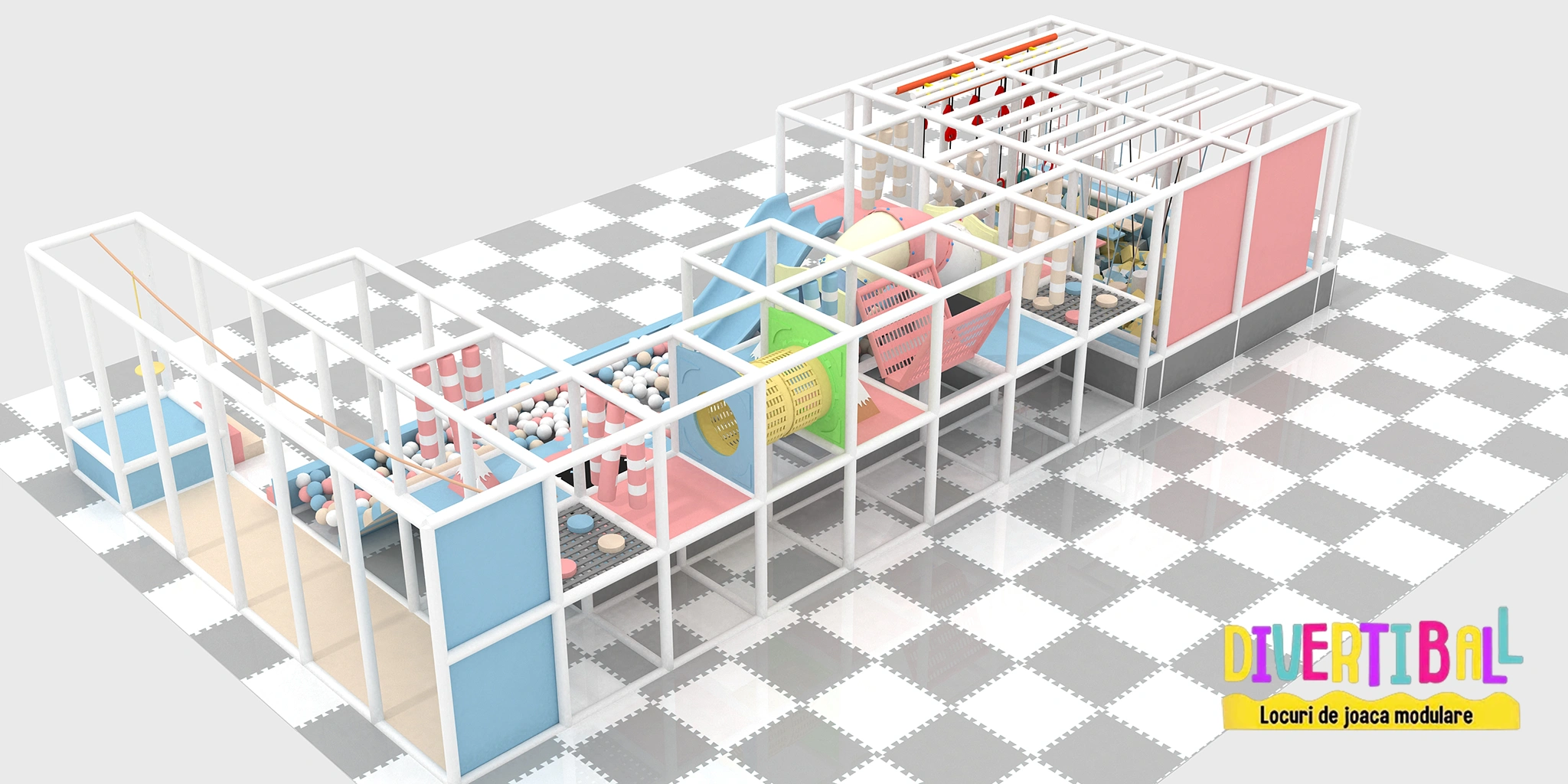 Locul de joacă este echipat cu bile pentru piscina cu bile, obstacole de tip saci de box și piramide, precum și diverse tunele de plasa și transparente, oferind o experiență captivantă pentru copii. De asemenea, structura include panouri de catarare, discuri de trecere, și cilindri rotativi, pentru a stimula abilități motrice și coordonarea.
