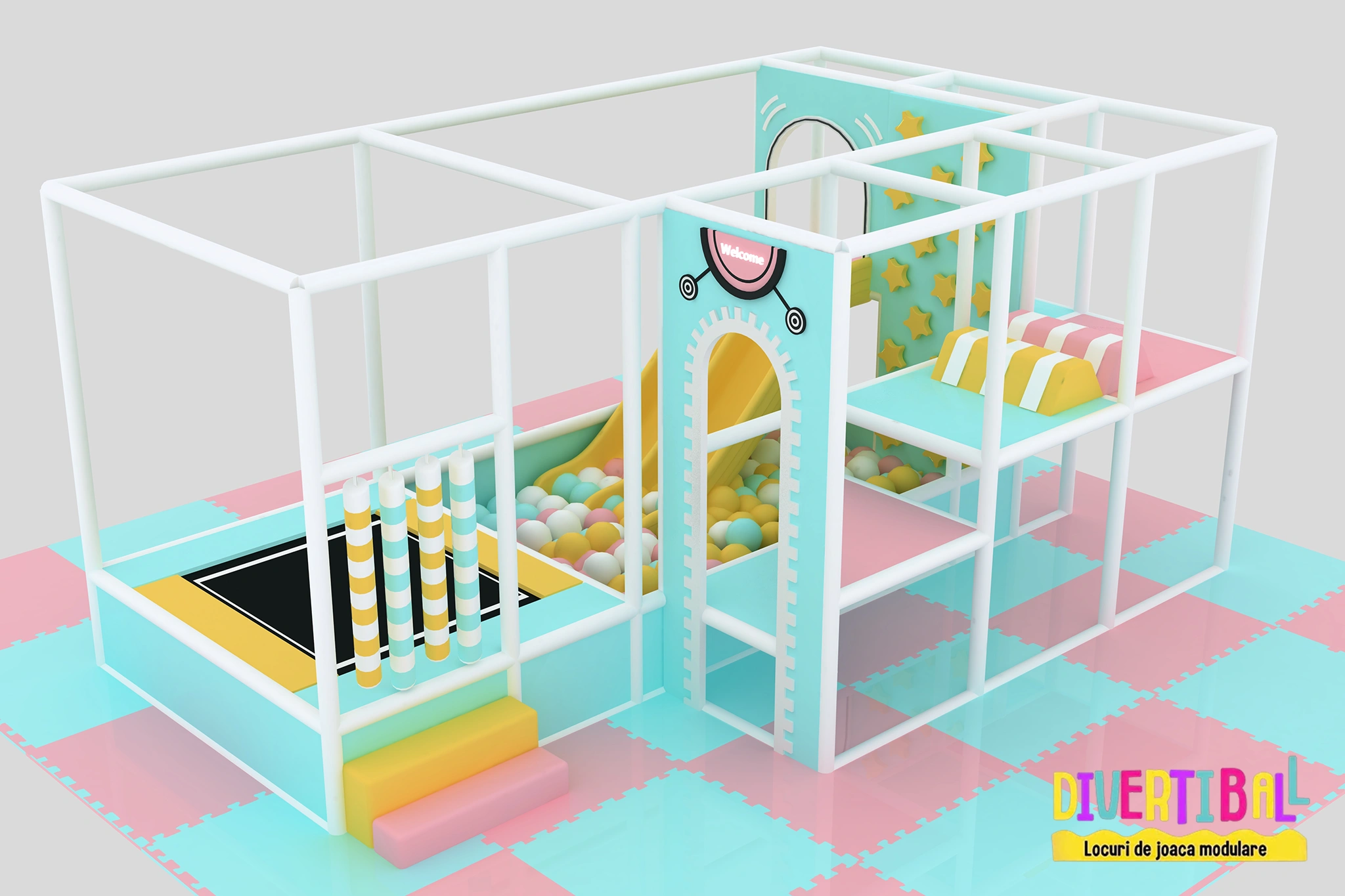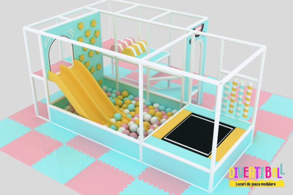 Include un tobogan, trambulină, piscină cu bile, obstacole variate și un pod de plasă, toate gândite pentru a stimula mișcarea, coordonarea și distracția celor mici.