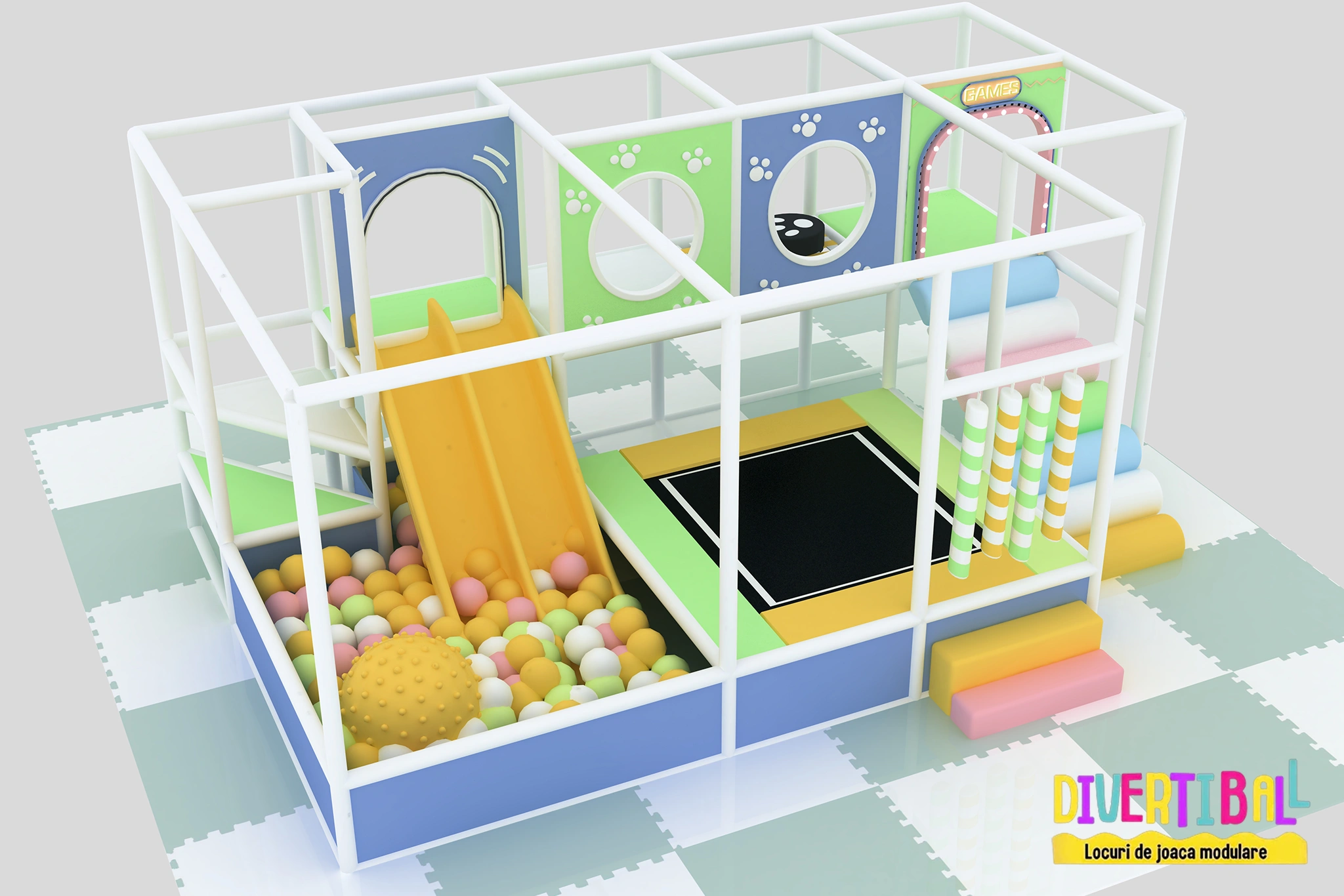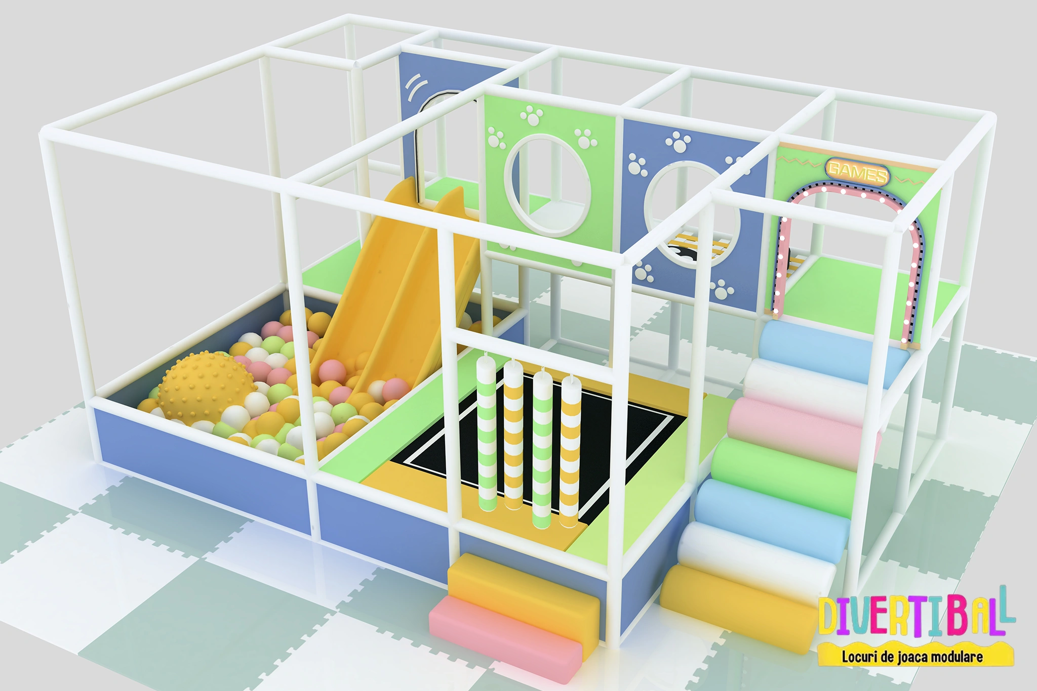 Acest loc de joacă modular energic de 6,25m x 3,00m x 2,80m este perfect pentru copii activi, fiind ideal pentru spații de joacă pentru copii interior. Dotat cu o varietate de activități, cum ar fi piscina cu bile, trambulina, și cosul de baschet, locul de joacă este conceput pentru a stimula dezvoltarea abilităților fizice și coordonarea. Cu obstacole tip sac de box și cilindri orizontali, acest loc de joacă adaugă provocări suplimentare pentru micii aventurieri. Este un loc de joacă modular, personalizabil pentru diverse tipuri de spații.