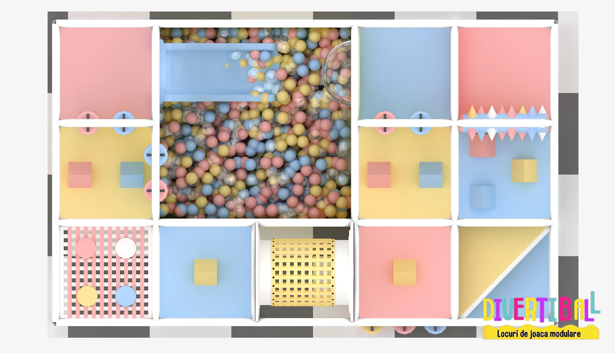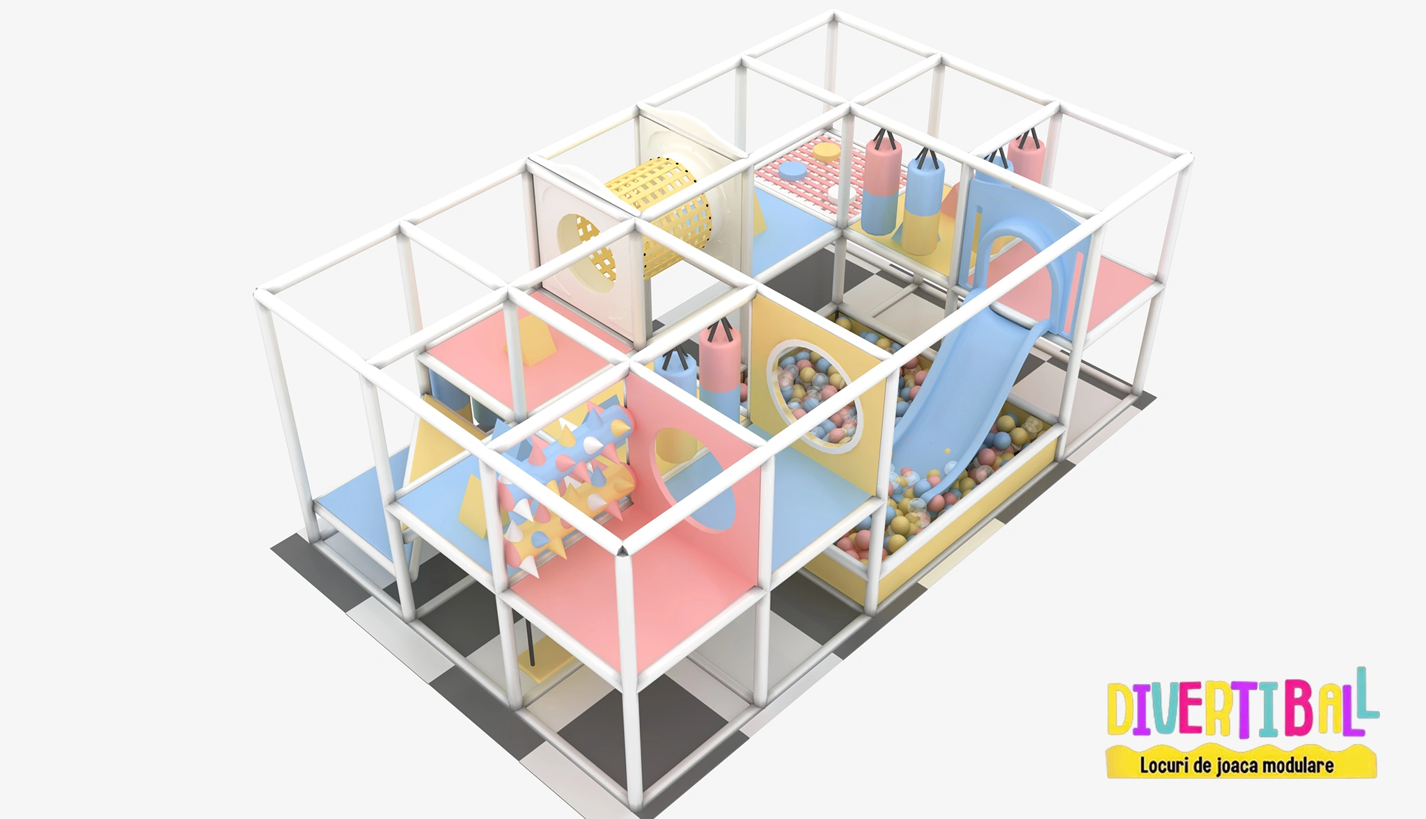 Locul de joacă modular pentru copii, cu dimensiuni de 6,00m x 3,70m x 2,80m, oferă o experiență completă de distracție, stimulând dezvoltarea fizică și motrică a copiilor. Este echipat cu un tobogan, bile colorate pentru piscina cu bile și obstacole interactive, precum panouri spider și platforme de plasă. Acest loc de joacă modular este ideal pentru amenajări de spații de joacă personalizabile, oferind diverse provocări care susțin dezvoltarea abilităților motorii ale celor mici.